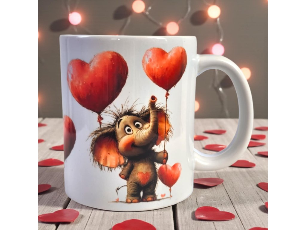 Roztomilý hrneček se sloníkem a srdíčky. Přesně tento krásný hrníček vyjádří přesně to, co cítíte. Ideální jako dárek k narozeninám, svátku či na Valentýna ... nebo prostě jen tak, z lásky