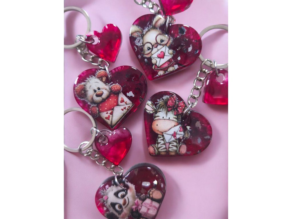 Ručně vyráběné klíčenky z epoxidové pryskyřice ve tvaru srdce s roztomilým motivem.