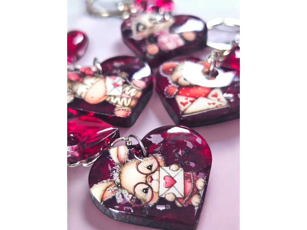 Ručně vyráběné klíčenky z epoxidové pryskyřice ve tvaru srdce s roztomilým motivem.