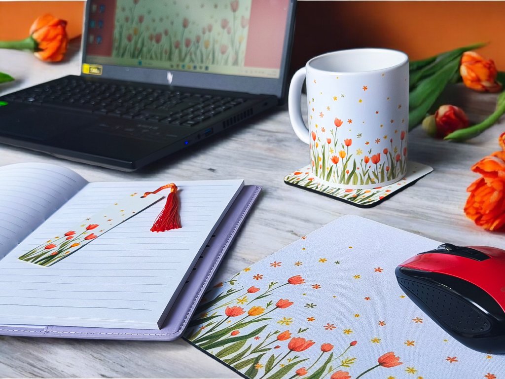 Velká jarní sada obsahuje hrnek na oblíbenou kávu, podtácek, podložku pod myš i záložku – všechno sladěné do jemného jarního stylu, který rozzáří každý pracovní den. 🌷