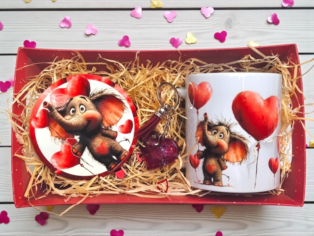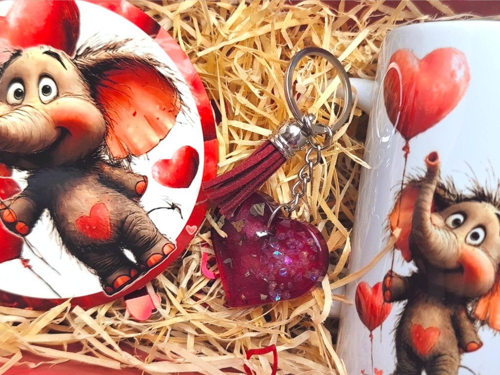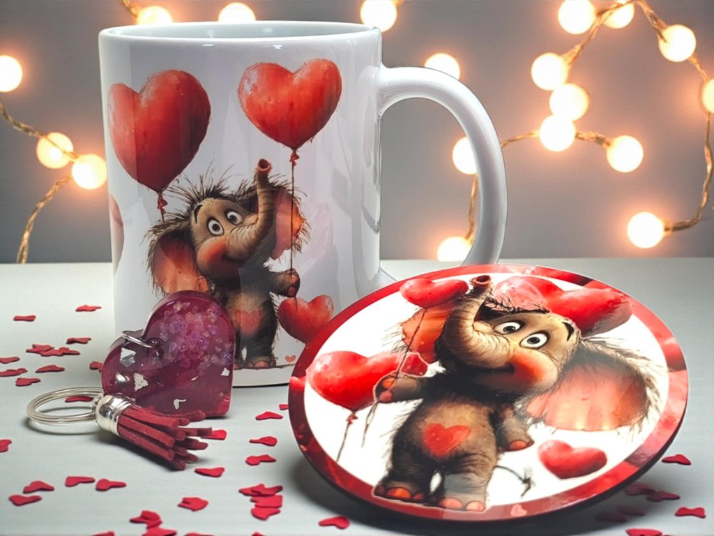 Zamilovaná valentýnská sada hrnečku, podtácku a ručně vyráběné klíčenky ve tvaru srdíčka s motivem roztomilého sloníka.